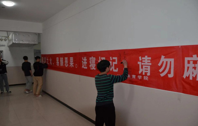 首先体育学院学生制作横幅,深入宣传消防法律法规、消防安全规定和消防安全,为我院各项工作再上一个新台阶创造良好的安全环境。然后组织学生横幅签字自觉注意消防安全,并告诫学生对宿舍内破损,陈旧不清的消防警示标志、消防器材和设施进行检查统计并上报,最后向同学们进行消防安全知识的讲解。同学们积极参加横幅签字活动、检查宿舍内的标志、器材并统计上报。